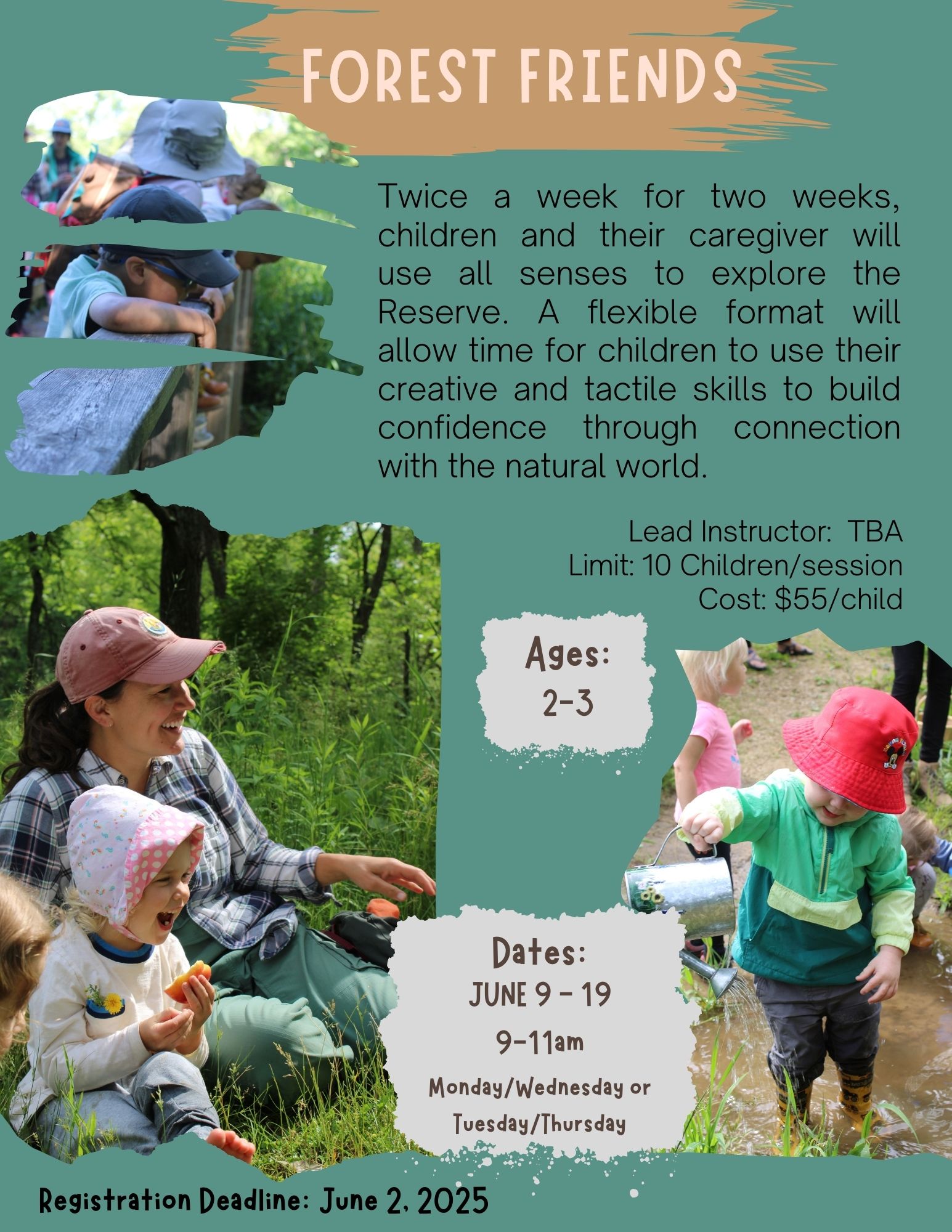 Twice a week for two weeks, children and their caregiver will use all their senses to explore several habitats and natural play areas on the Reserve. A flexible format will allow time for children to use their creative and tactile skills to build confidence through connection with the natural world.