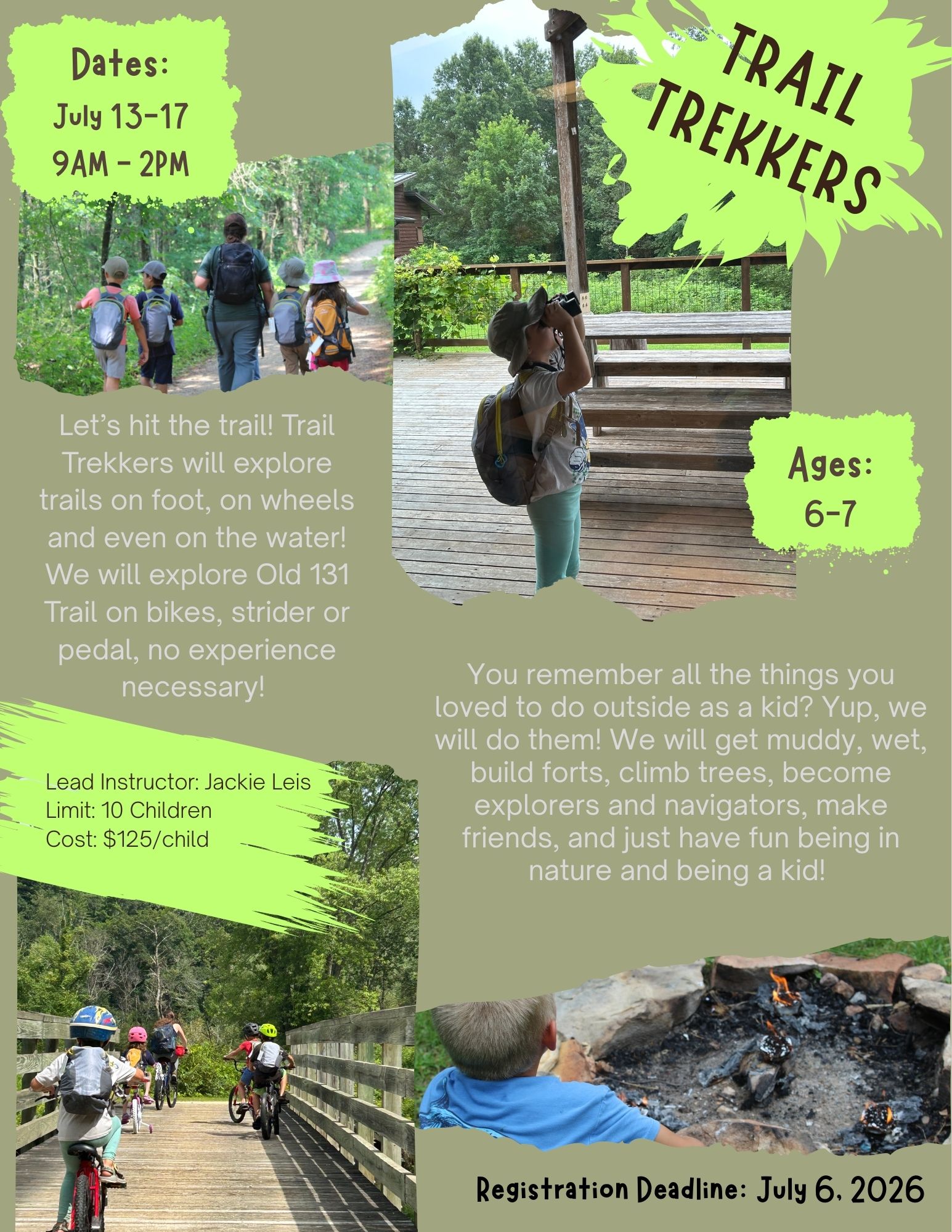 Ages 6-7: Trail Trekkers Let’s hit the trail! Trail Trekkers will explore trails on foot, on wheels and even on the water! We will explore Old 131 Trail on bikes*, strider or pedal, no experience necessary! Hike our way to a day camp and explore tent camping. Build pint sized boats and rafts and float them down a child friendly stream. All the things you loved to do outside as a kid, yup, we will do them! We will get muddy, wet, build forts, climb trees, become explorers and navigators, make friends, and just have fun being in nature and being a kid!