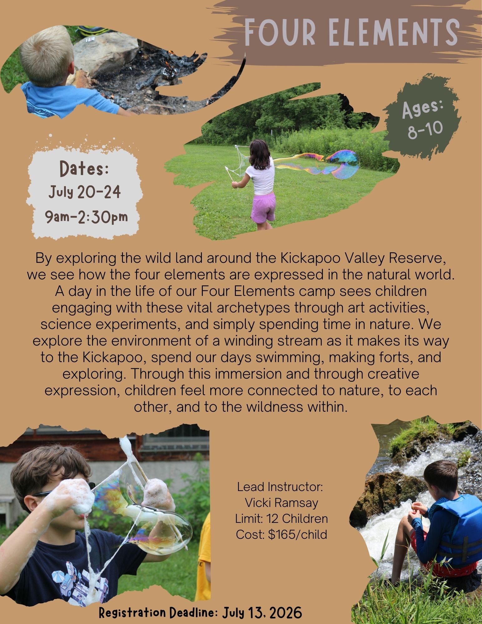 Each camper will have the opportunity to discover and learn new things firsthand by seeking, spying, tracking animals, catching little critters, drawing, and sharing. Be prepared for hiking, storytelling, nature crafts, and games. Interactive games will stress involvement and cooperation while respectful behaviors in nature will be emphasized. Along with individual discovery there will be time for group collaboration and time to take advantage of the moment.