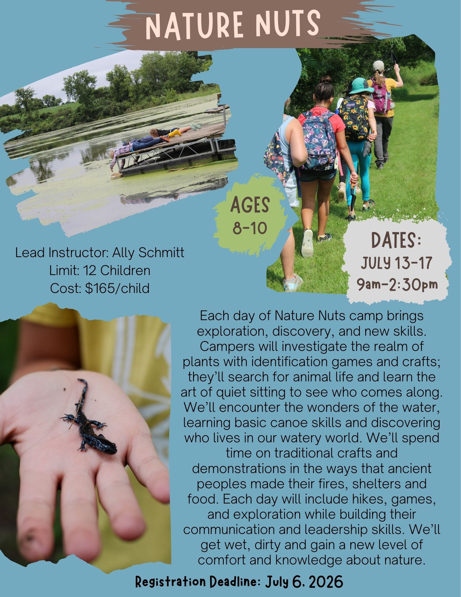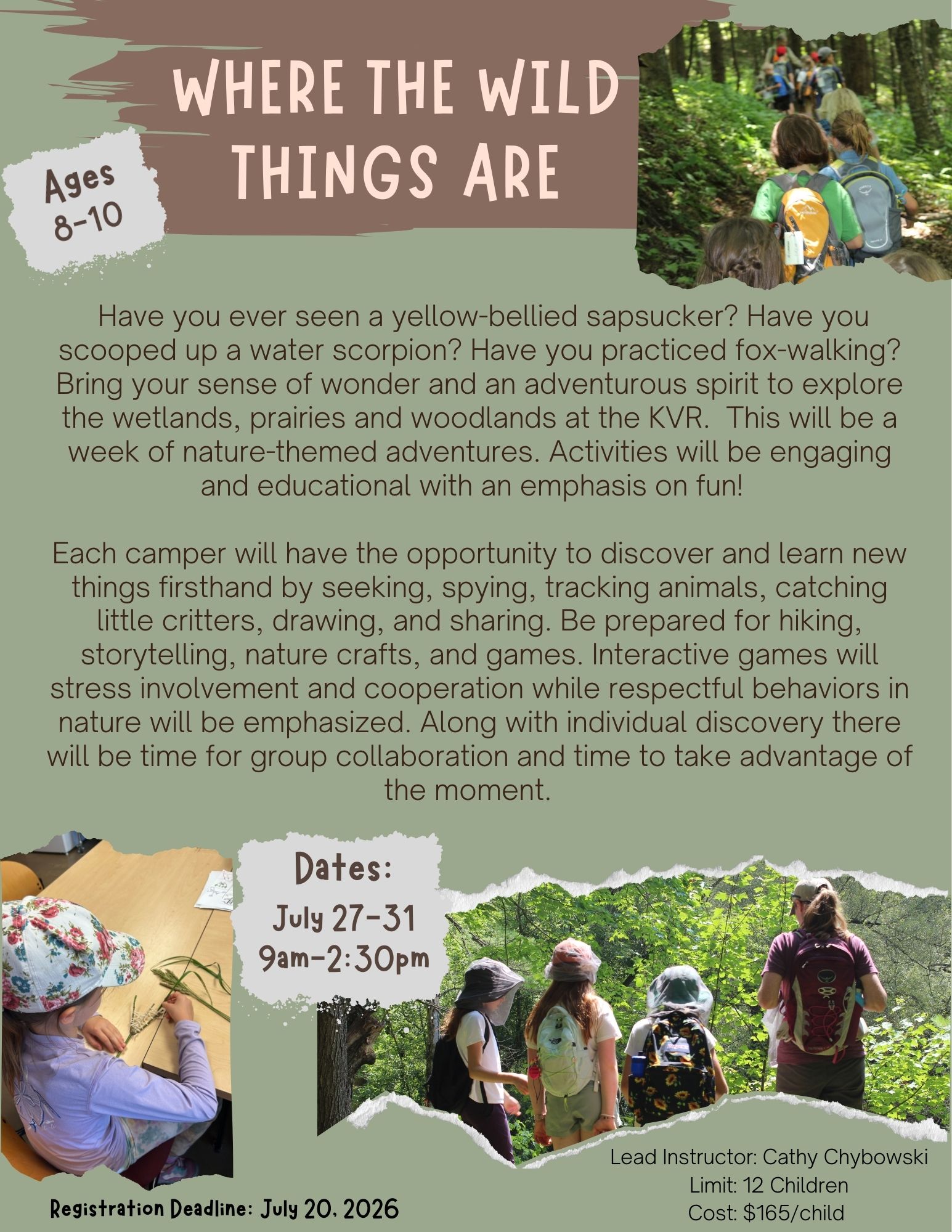 Have you ever seen a yellow-bellied sapsucker? Have you scooped up a water scorpion? Have you practiced fox-walking? Bring your sense of wonder and an adventurous spirit to explore the wetlands, prairies, and woodlands at the KVR. This will be a week of nature-themed adventures. Activities will be engaging and educational with an emphasis on fun!